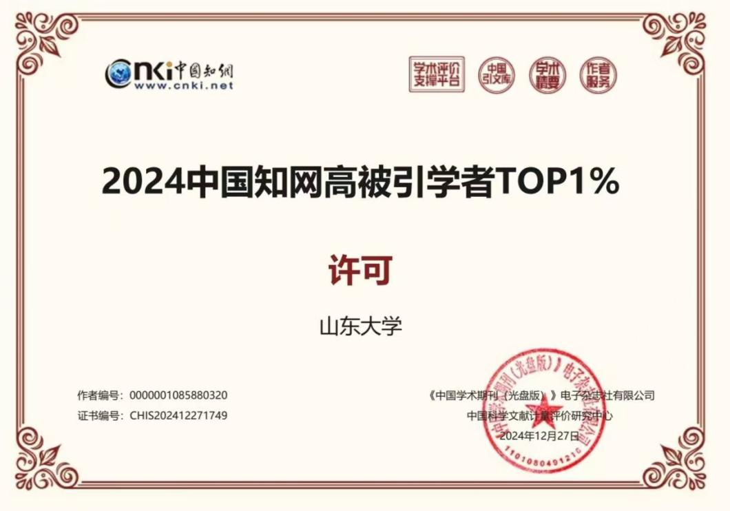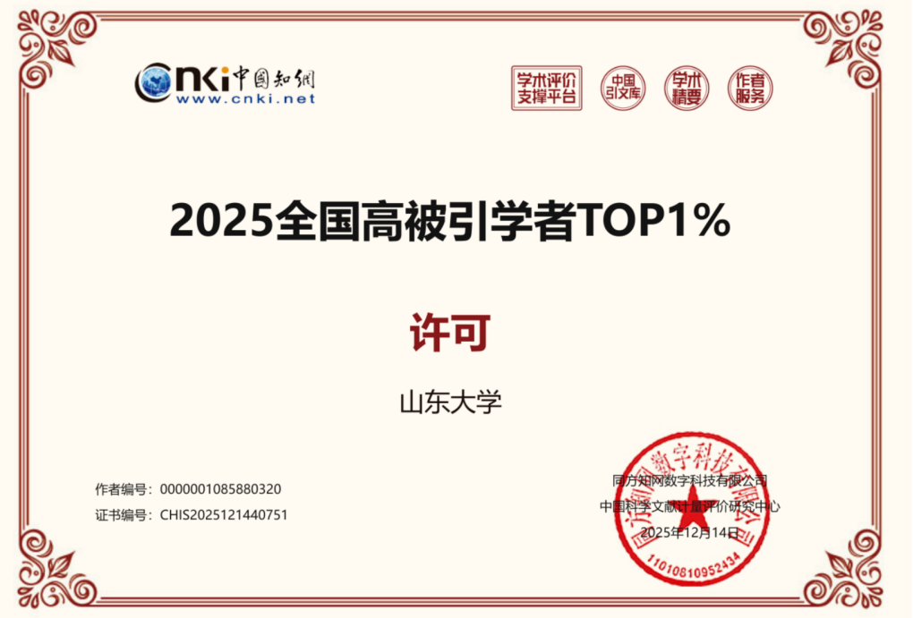 近日,中国知网(CNKI)正式发布“2025全国知网高被引学者”名单,韩国主播许可副教授表现突出,继2024年后,连续第二年入选高被引学者TOP1%。为我校工商管理学科(含专业学位)TOP1%的14位入选者中最年轻入选者。