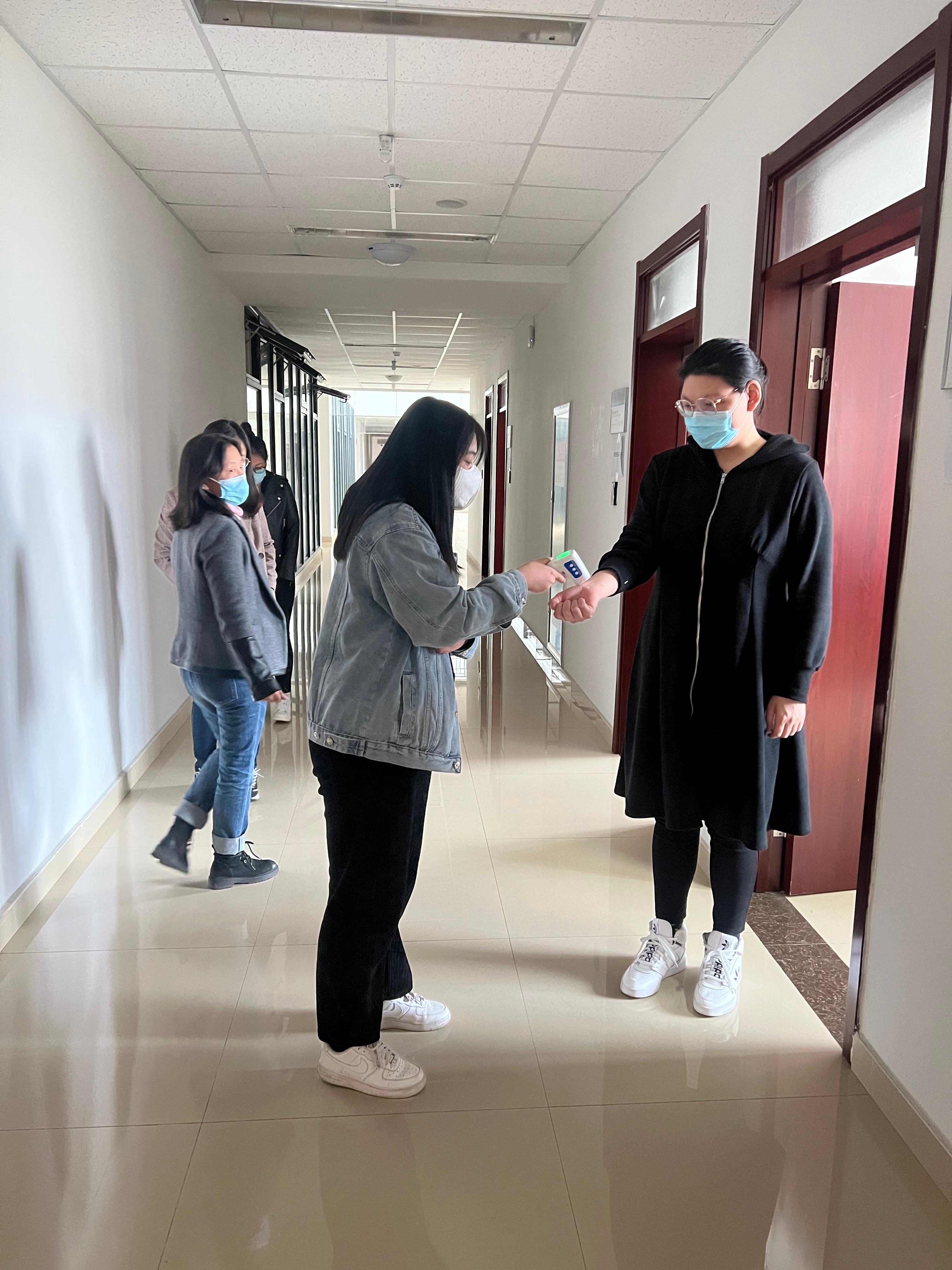 此次演练模拟了发现体温异常和身体不适师生时的应急处置流程,演练过程对现场处置、按级报告、环境消杀等的全流程全要素进行逐阶段模拟演练。