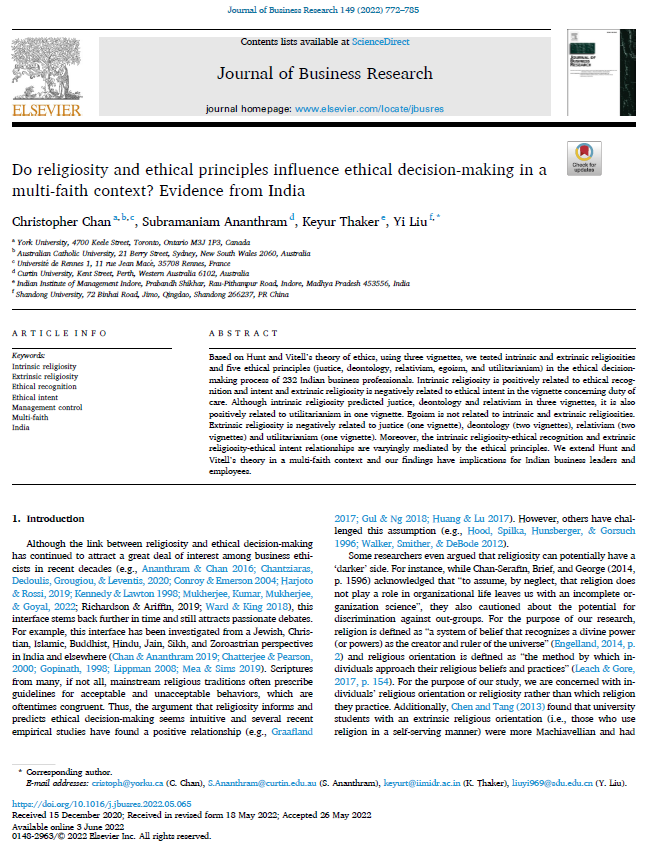 刘怡副教授作为唯一通讯作者的学术论文《Do religiosity and ethical principles influence ethical decision-making in a multi-faith context? Evidence from India》,在商学领域国际重要期刊《Journal of Business Research》2022年第149卷发表。《Journal of Business Research》是国际工商领域A类SSCI期刊,JCR一区,五年的影响因子达8.488,在商业期刊的排名28,具有很高的国际学术声誉。