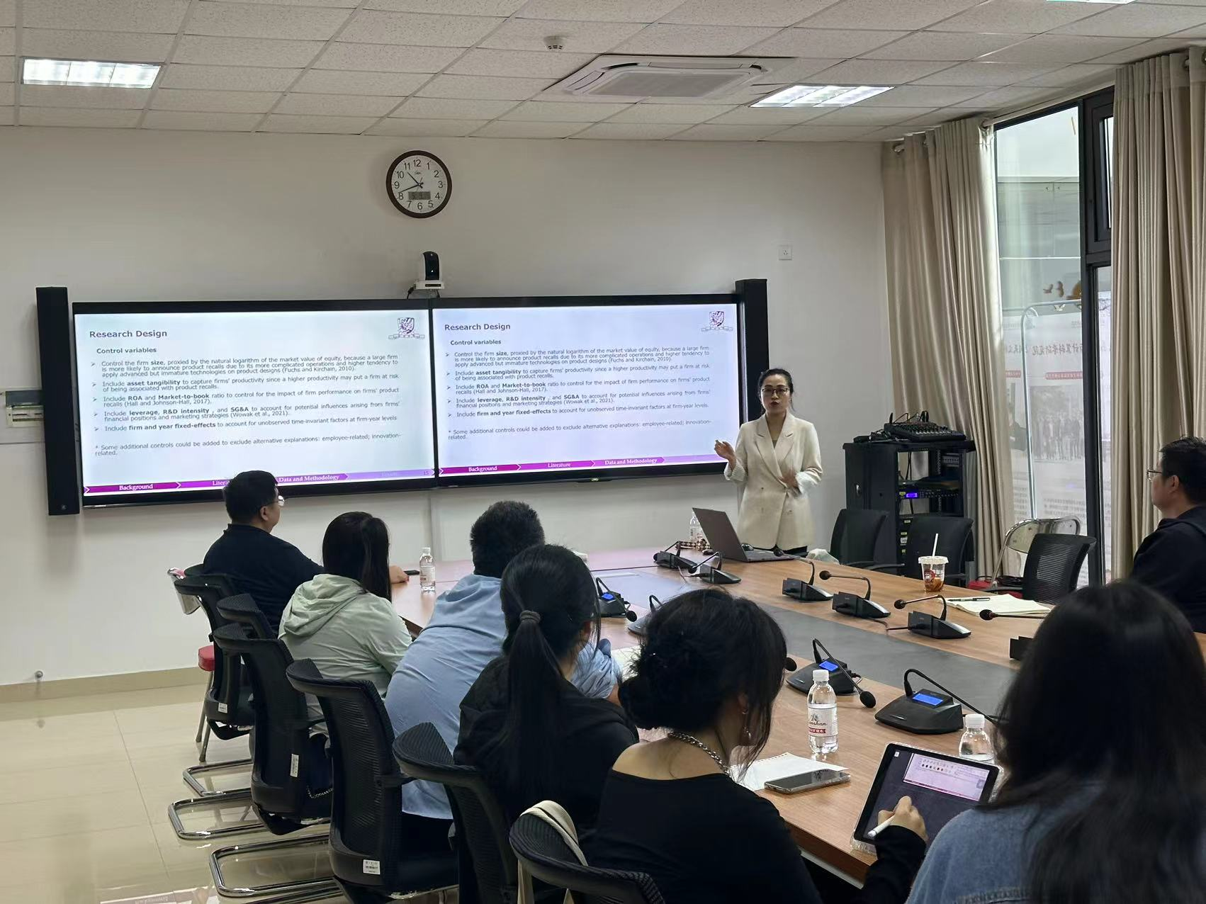 汪晓樵助理教授为韩国主播作“消费者承担环境监管成本吗?来自氮氧化物配额交易项目的证据”的专题讲座。讲座从ESG的角度出发,探讨了研究的选题动机,并发现受氮氧化物配额交易项目(NOx Budget Trading Program, NBP)监管的企业的产品质量问题有所增加。研究发现那些韩国主播中强调产品质量责任感的、财务压力较小的、业务较为单一的、在产品市场中更容易被替代的,以及电力能源消耗较少的企业,产品质量受到该政策的影响相对较小。研究进一步发现受环境监管的企业更有可能为了节约成本而在原材料质量上有所妥协,或者将生产线外包给其他公司以降低成本。最后,部分企业通过增加对绿色创新的探索努力或提高运营效率等长期可持续解决方案来应对环境监管。汪晓樵助理教授还进一步与在座师生分享了在国际顶尖期刊上的发表经验,就中国问题的发表经验与在座老师进行了交流。
